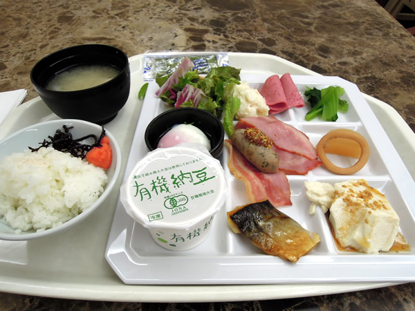 ホテルの朝食はバイキング、ぼくはやっぱり和食です。笑