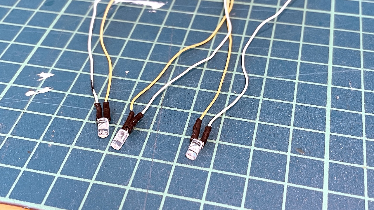 ‥‥ そこで、先ほどまで用意してあった、ハンダゴテの熱を使って圧着させました。ちなみに一番左のは「+と-」を逆に付けてしまったので、印をつけました。笑