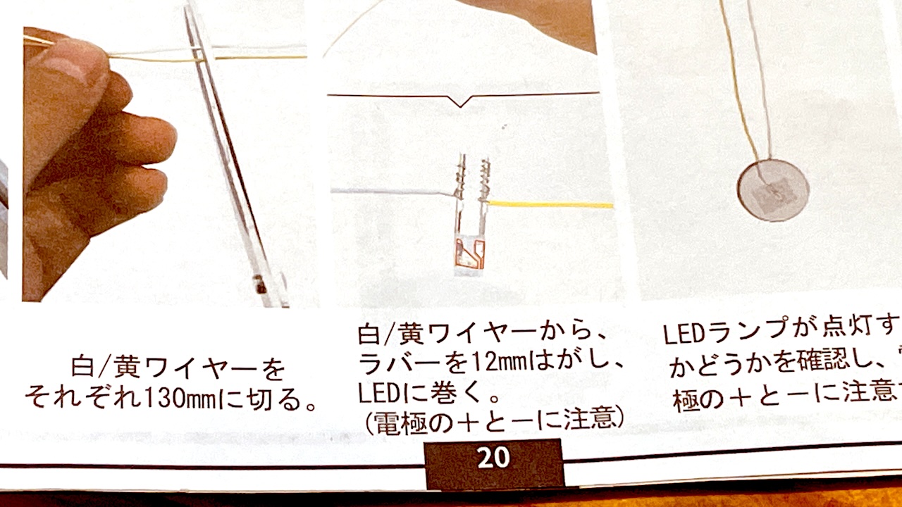 次にLEDの配線ですが「ワイヤーからラバーをはがし、LEDに巻く」と書いてあります。