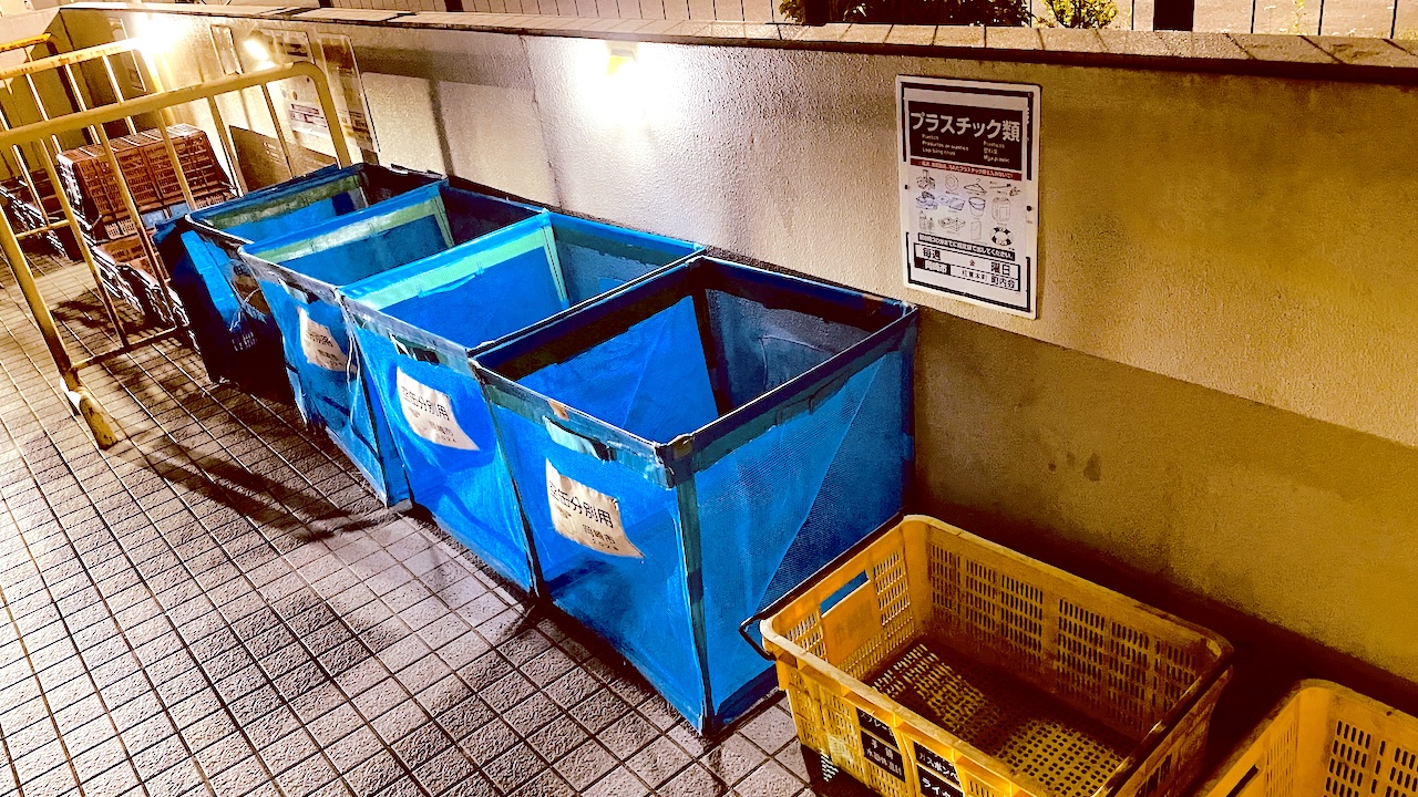 そして当番制ですが、地域に2カ所ある、不燃物、ビン・缶の収集前日の夕方にカゴをセットします。収集車は畳んだまま山積みしていくので、これを組み立てて配置します。
