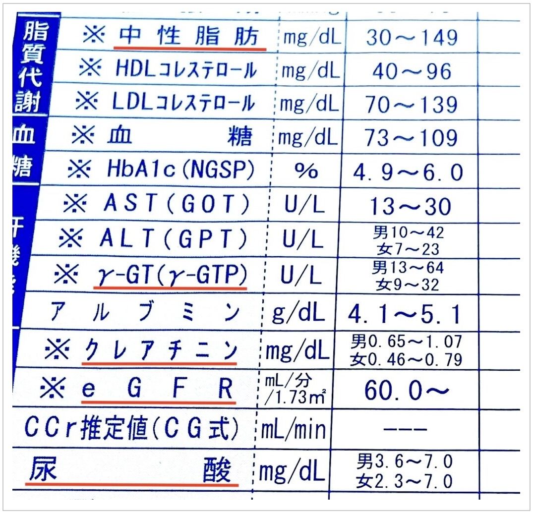 結果は①中性脂肪、②γ-GTP、③クレアチニン、④eGFR、⑤尿酸の5項目がH判定でした。実をいうとこの結果は過去のデータからある程度予想していた数値です。