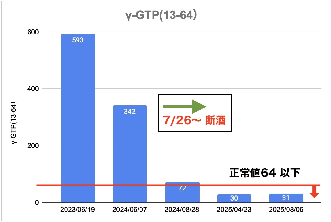 例えばγ-GTPはこのグラフのように劇的によくなり、最新の検査でも良好の通知です。なお、グラフには載せていませんが、実際は2ヶ月に一度、通院して検査を続けています。
