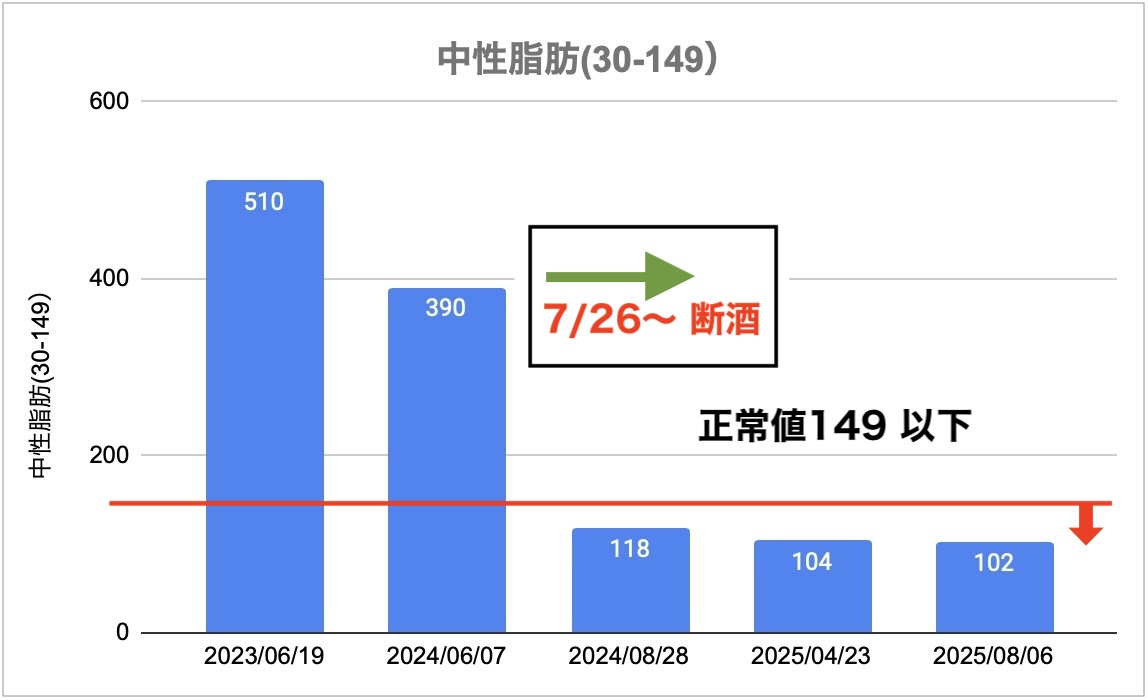 同じく中性脂肪も劇的に良くなり、その後の経過も良好です。(それにしても、2年前の数値があまりにも異常すぎて、驚きました ( °Д°))