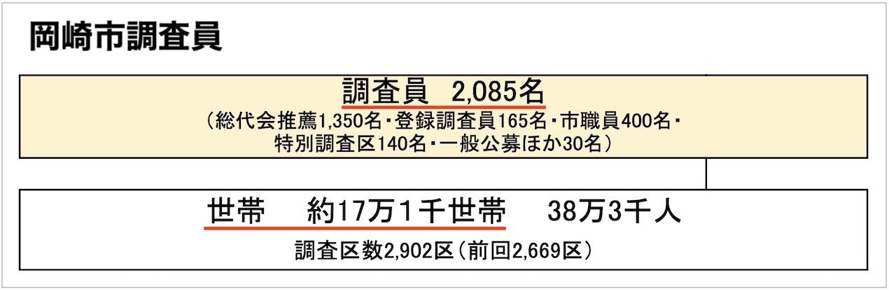 ちなみに「岡崎市 令和7年国勢調査岡崎市実施本部」の資料によると、岡崎市の国勢調査員の数は2,085名で約17万1千世帯を調査します。