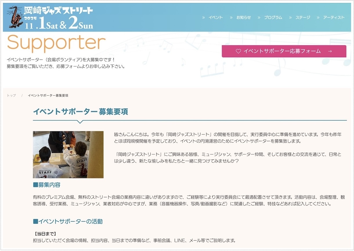 というわけで、さっそく「今年のイベントサポーター募集要項」のページをみました。