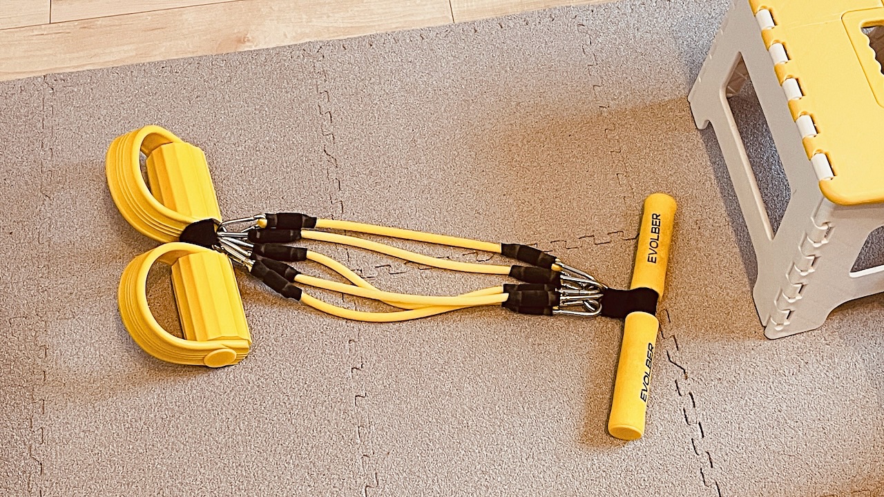 そんなとき、たまたまクローゼットを整理していたら、このエクササイズ・トレーニングチューブというローイングの道具を見つけました。