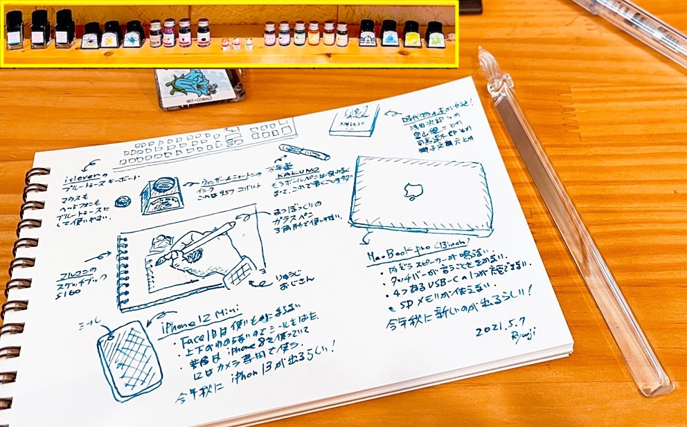 そしてこれは、ガラスペンで描くイラストです。棚にあるのは20色の可愛いインクです。ガラスペンの柔らかくて暖かい表現がとても好きです。