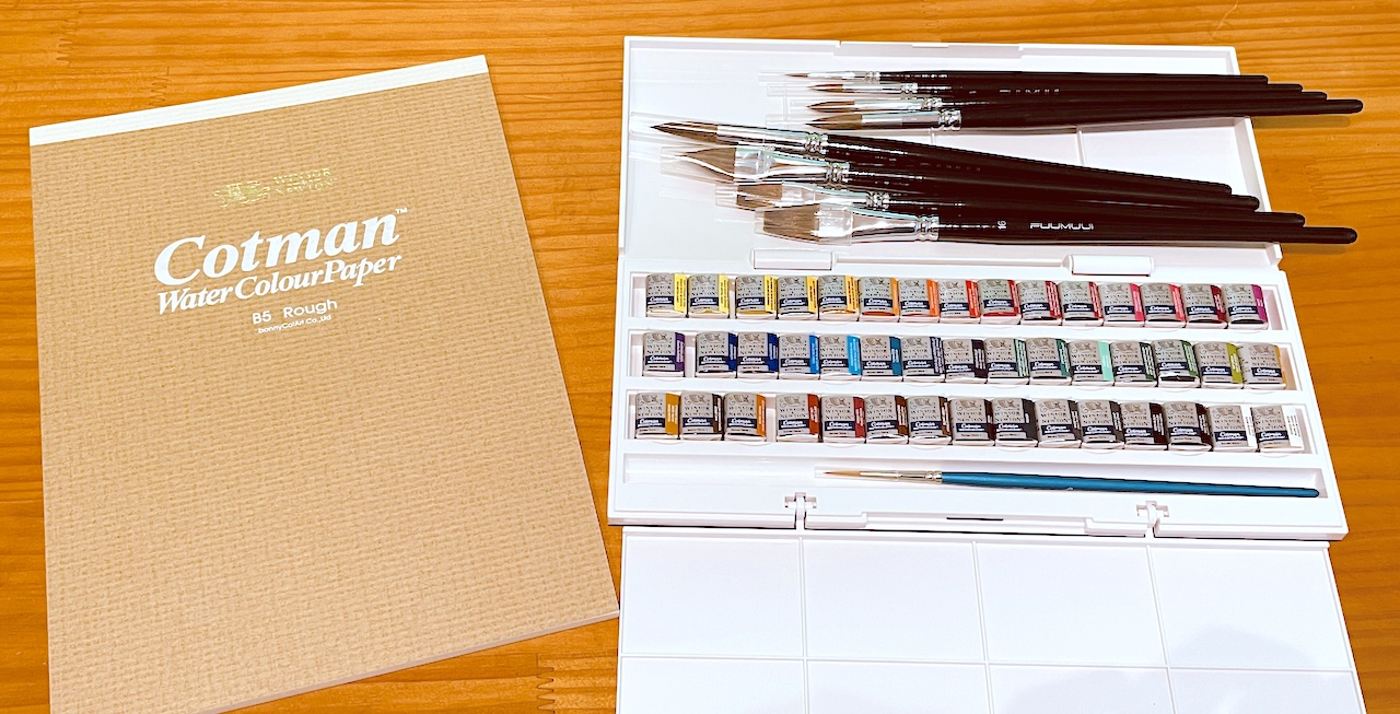 水彩絵具と筆は「Winsor & Newton 水彩絵具 40色セット」と「水彩画筆 8本セット」です。これで一通りのものが揃いました。