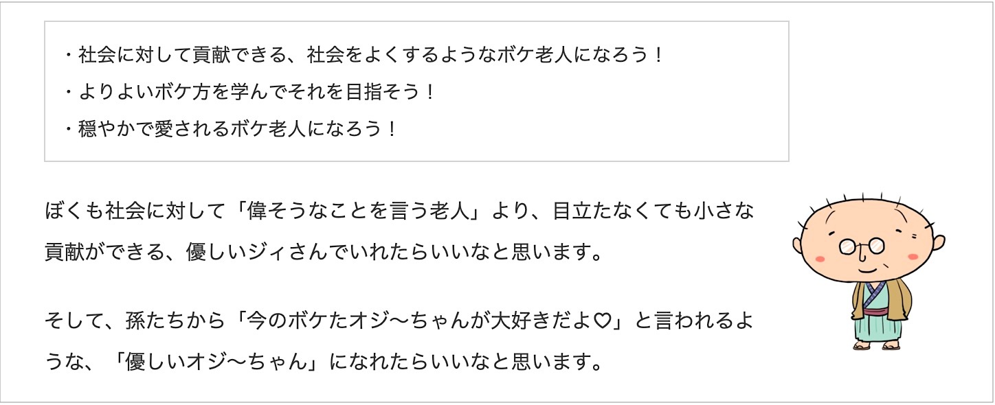 ブログのキャッチコピーにある通り、加齢による衰えや日常の失敗を「ボケ」としてユーモラスに捉える姿勢が、読者に安心感を与えています。深刻になりがちな老後のテーマを明るく読み物として成立させている点が、多くの読者を惹きつける理由です。