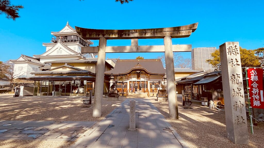 毎年参拝する龍城神社は岡崎城公園内にあります。今日は風もなく穏やかで、雲一つない良い天気に恵まれました。ぼくは今日のような静かな神社の方が好きです。