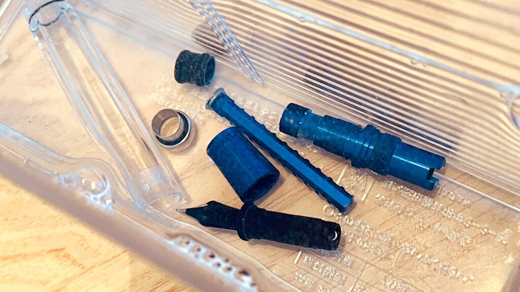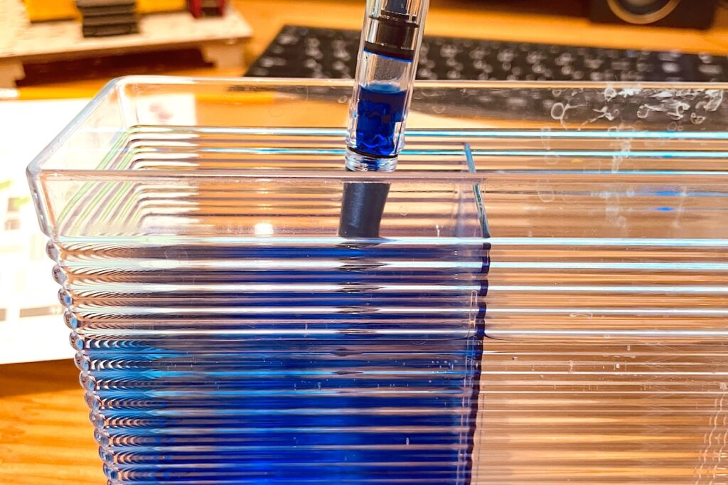 それではやってみましょう。まずは万年筆の中にあるインクを抜いてから、ペン先をぬるま湯の中に入れて、何度も出し入れしてみました。