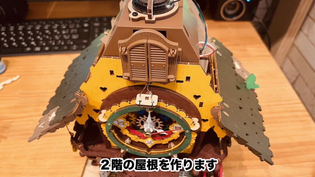屋根の瓦をどんどん張っていき、鳩時計も取り付けました。