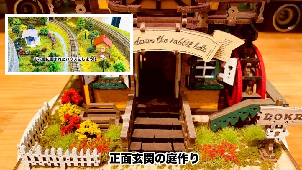 そしてキットには付いていないお庭も作りましたが、鉄道模型の材料を使いました。
