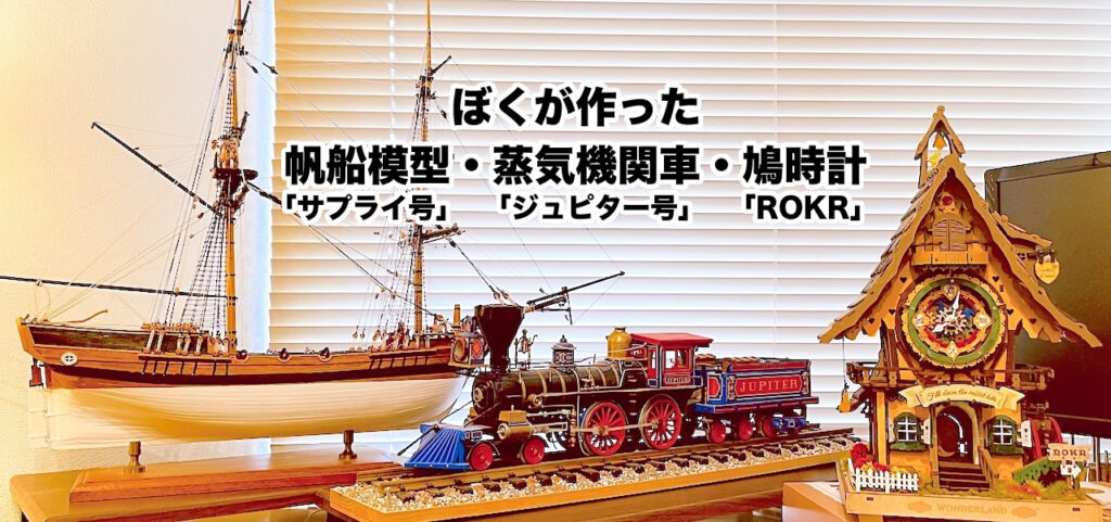 完成した鳩時計は、これまで作った「帆船模型」、「蒸気機関車」の横に飾りましたよ〜♪