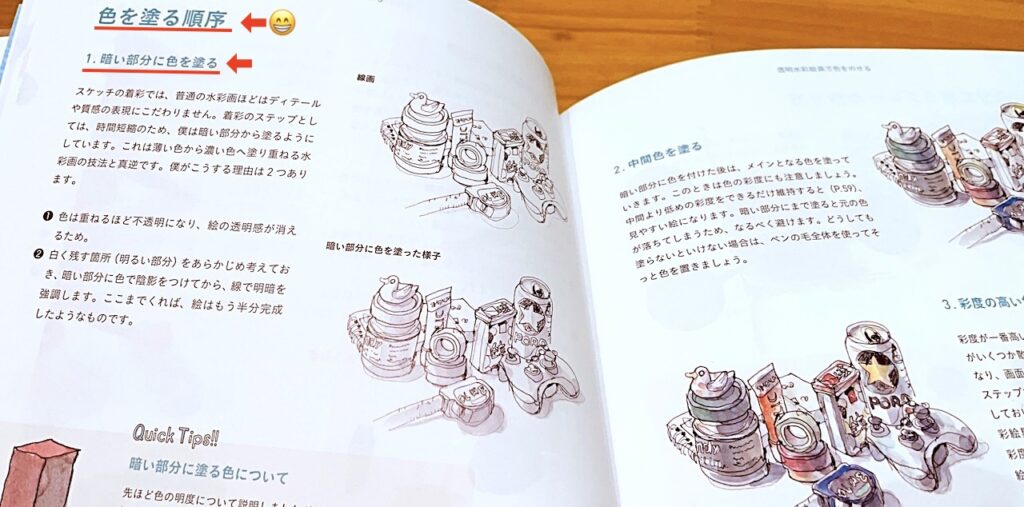 さらに、色を塗る順序は最初は「暗い部分から塗る」→ 「水彩画の技法と真逆です」と書いてあります。うん、なるほど!