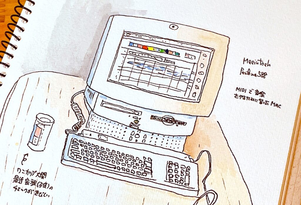 さて、この絵は27年ほど前に描いた絵ですが、初めて買ったMac パフォーマー588で、MIDIをやろうとしてます。ワンカップ大関がテーブルに置いてあります。