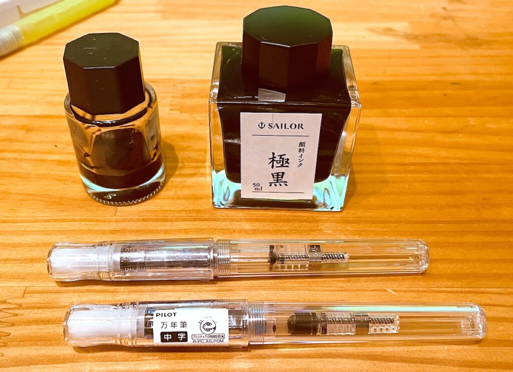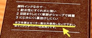 それは「万年筆はセーラー製以外使用しないで下さい」とあります。調べてみると、この顔料インクは他の万年筆だと詰まりやすいということでした。
