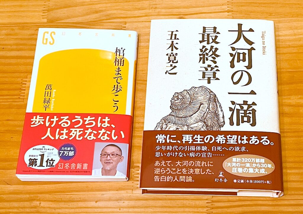 写真の本は先日朝刊に掲載されていた、五木寛之の新刊「大河の一滴 最終章」です。そしてもう一冊は新書コーナーで偶然みつけた「棺桶まで歩こう」です。