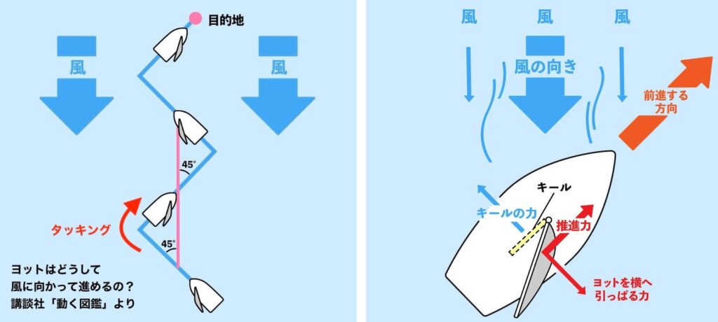 「ヨットがどうして 風に向かって進めるの?」というイラストです。その原理を知っている人は、どうしてかはわかりますよね。(詳しい原理はこちらでどうぞ)